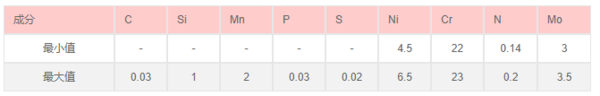 022Cr23Ni5Mo3N管材料相當于ASME什么材料?022Cr23Ni5Mo3N (S22053)屬于國標雙相不銹鋼,執行標準:GB /T 20878-2007,相當于ASME S32205。022Cr23Ni5Mo3N (S22053)化學成分如下圖: